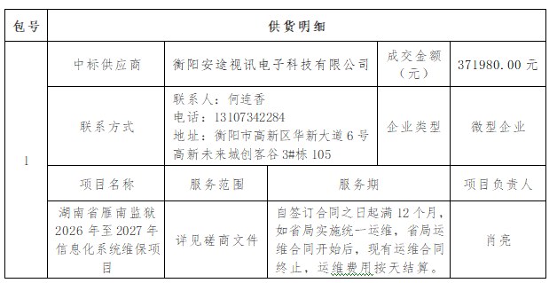 湖南省雁南监狱2026年至2027年信息化系统维保项目中标(成交)公告