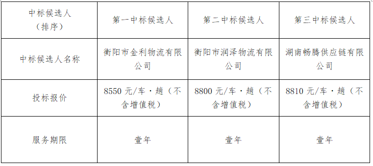 湖南衡阳往返山东潍坊单程1600公里17.5米半挂车运输线路服务项目中标候选人公示
